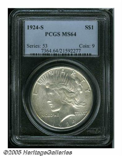 <B>1924-S<S$1> MS64 PCGS.</B></I> A well struck example of this scarcer issue that shows almost complete, though faint, details on the wing of the eagle. Snow-white in color.