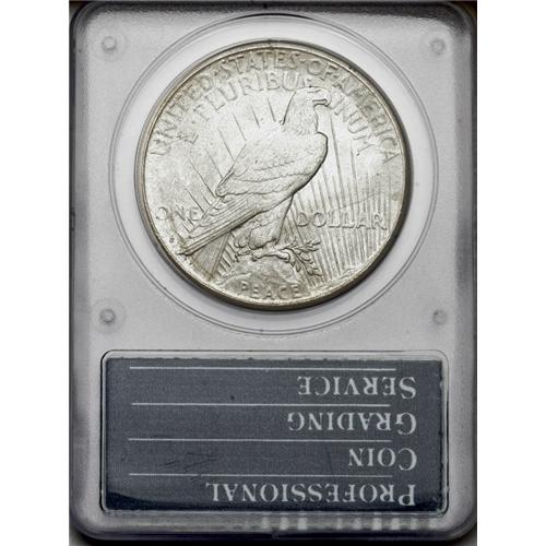 <B>1924-S<img border='0' src='http://www.heritagecoins.com/images/star.gif' width=10 height=10>$1> MS64 PCGS.</B></I> Creamy-silver patina overlies glowing luster and numerous die striations, particularly on the obverse. Sharply struck, with a few grade-limiting marks on Liberty's cheek and neck. What appears to be a small piece of paper or cardboard is entombed in the holder, and rests in the left obverse field. Housed in a first generation PCGS holder.