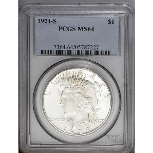 <B>1924-S<img border='0' src='http://www.heritagecoins.com/images/star.gif' width=10 height=10>$1 MS64 PCGS.</B></I> Frosty surfaces display whispers of light tan color, especially on Liberty's motif. Sharp definition is noted on the design elements, and a few ticks on the eagle and reverse fields limit the grade.