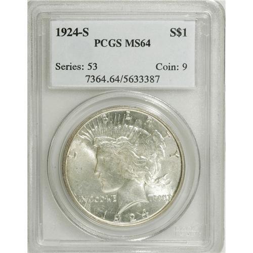 <B>1924-S S$1 MS64 PCGS.</B></I> Gentle walnut-tan freckles grace both sides of this lustrous and well preserved Peace dollar. A good strike with only minor merging of details in the center.<BR><BR><b>Shipping:</b> Coins & Currency (<a target="_blank" href="http://www.heritageauctions.com/common/shipping.php">view shipping information</a>)