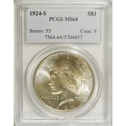 <B>1924-S S$1 MS64 PCGS.</B></I> Outstanding luster radiates from light gold and ice-blue surfaces, and a well-executed strike emboldens the design features. A few luster grazes on Liberty's cheek and neck prevent an even higher grade.<BR><BR><b>Shipping:</b> Coins & Currency (<a target="_blank" href="http://www.heritageauctions.com/common/shipping.php">view shipping information</a>)