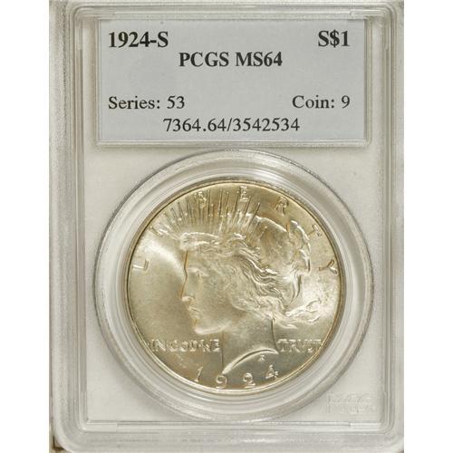 <B>1924-S S$1 MS64 PCGS.</B></I> Potent luster enlivens both sides of this near-Gem, each of which exhibits whispers of olive-green and golden-tan color. The obverse shows excellent definition on the design elements, while portions of the eagle's plumage are a tad soft, as normal for the issue. David Bowers (2006) contends that: "Mint State pieces are usually seen bagmarked." On this example, a couple of trivial marks on each side just barely preclude full Gem status.<BR><BR><b>Shipping:</b> Coins & Currency (<a target="_blank" href="http://www.heritageauctions.com/common/shipping.php">view shipping information</a>)