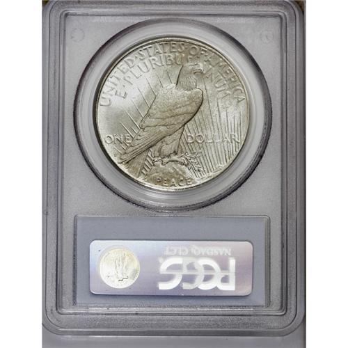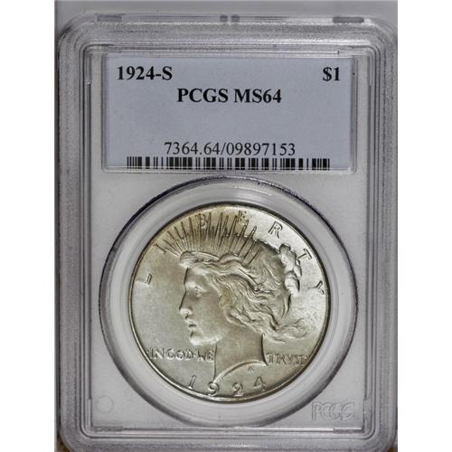 <B>1924-S<img border='0' src='http://www.heritagecoins.com/images/star.gif' width=10 height=10>$1> MS64 PCGS.</B></I> This sharply struck example is a satiny and highly lustrous near-Gem with brilliant silver surfaces and pale champagne toning. A few bagmarks are present on Liberty's cheek.