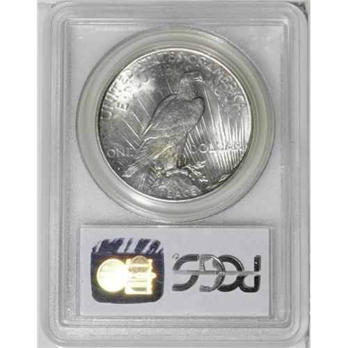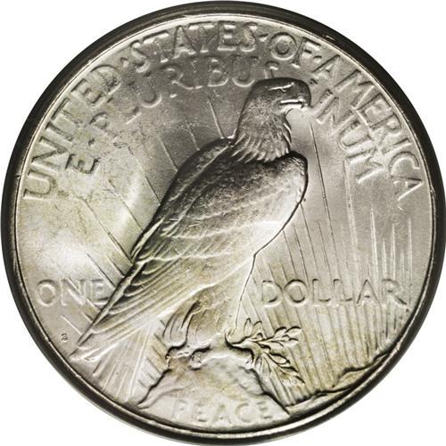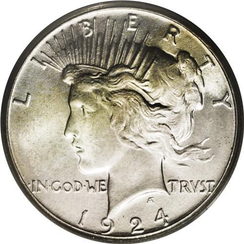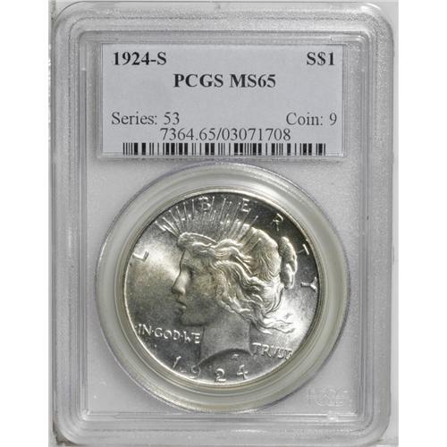 <B>1924-S<img border='0' src='http://www.heritagecoins.com/images/star.gif' width=10 height=10>$1> MS65 PCGS.</B></I> A frosty Gem and seldom encountered in such exceptional grade. Both sides are fully brilliant with silvery-white luster and pale yellow toning in narrow bands across the obverse and reverse. Specialists will quickly recognize the importance of this coin, a rarity in Gem condition. Population: 63 in 65, 5 finer (8/06).