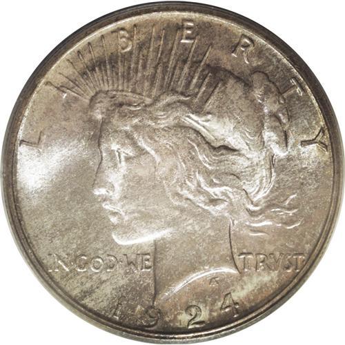 <B>1924-S<img border='0' src='http://www.heritagecoins.com/images/star.gif' width=10 height=10>$1> MS65 PCGS.</B></I> Beautifully toned in streaks of iridescent gold, lavender, and teal. A sharply struck and highly lustrous Gem example of this conditionally elusive date with slight reflectivity at the obverse periphery. Appealing and worthy. Population: 64 in 65, 5 finer (7/06).