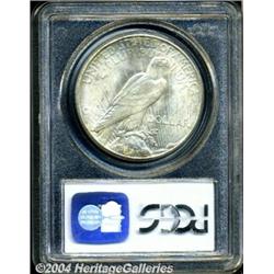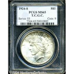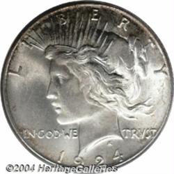 <B>1924-S<S$1> MS65 PCGS.</B></I> While not as elusive as 1925-S, 1927-S, and 1928-S, the 1924-S is still a major conditional rarity, and is potentially the most difficult issue to obtain in Gem state aside from the three dates mentioned above. The intensity of the luster gracing this specimen cannot be overstated, and it boldly enhances every aspect of the coin's appearance, including the flawless rough satin surface textures, pale gold hues and iridescent multicolored undertones of the fields and devices, and vivid, mottled splashes of tangerine patina along the rims. Two minute nicks on Liberty's cheek are the only visible flaws on the well preserved surfaces. Population: 60 in 65, 5 finer (3/04).<BR><I>From the JFS Collection.</B></I> <BR><BR><B>Important notice:</B> Heritage usually auctions material at the rate of 200-250 lots per hour. On some occasions eBay Live bid software or the Internet may not be able to keep up with the pace of the auction. We recommend placing a realistic absentee bid now as insurance to avoid disappointment. Occasionally the auctioneer may eliminate or reject an eBay Live bid, and the auctioneer may also reopen a lot after the close of the eBay live bidding (usually because we missed an audience bid), and may reject your bid even if it shows you as the winning bidder. By bidding via eBay Live, you agree that Heritage may award the lot to another bidder at its sole discretion under the circumstances described above or any other reasonable circumstances. Since eBay bids are not shown to us until we open the lot on the floor, we treat those bids just like floor bids. In most cases the floor responds before the eBay bid is presented to us, due to Internet lag time, so for consistency we have made it a policy that floor bids are always considered first over tie eBay live bids. Also please note that all Heritage lots purchased through eBay Live carry a 20% Buyer's Premium. Please make sure you read the Terms and Conditions before you bid. </span></font></tr></table></td></tr></table>