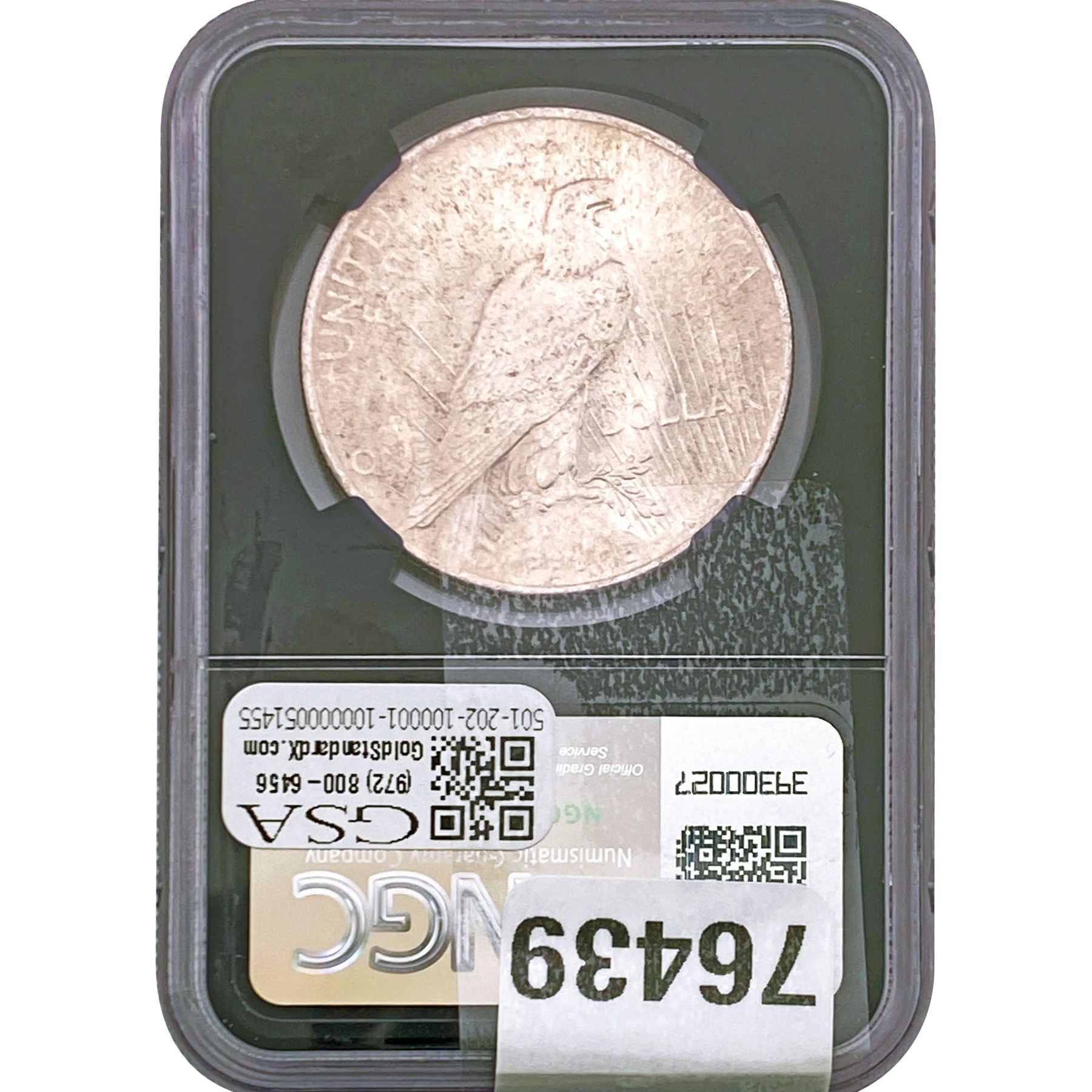 e. Coins sold referencing a third-party grading service are sold “AS IS” without any express or implied warranty, except for a guarantee by GSA that they are genuine. Removal or alteration of the holder, voids all of Bidder’s claims concerning that Product. Certain warranties may be available from the grading services and Bidders are referred to them for further details: Numismatic Guaranty Corporation (NGC), PO Box 4776, Sarasota, FL 34230, www.ngccoin.com/services/writtenguarantee.asp; Professional Coin Grading Services (PCGS), PO Box 9458, Newport Beach, CA 92658, www.pcgs.com/guarantee.html; ANACS, 6555 S. Kenton St., Ste. 303, Englewood, CO 80111; and Independent Coin Grading Co. (ICG), 7901 East Bellview, Ave., Suite 50, Englewood, CO 80111.