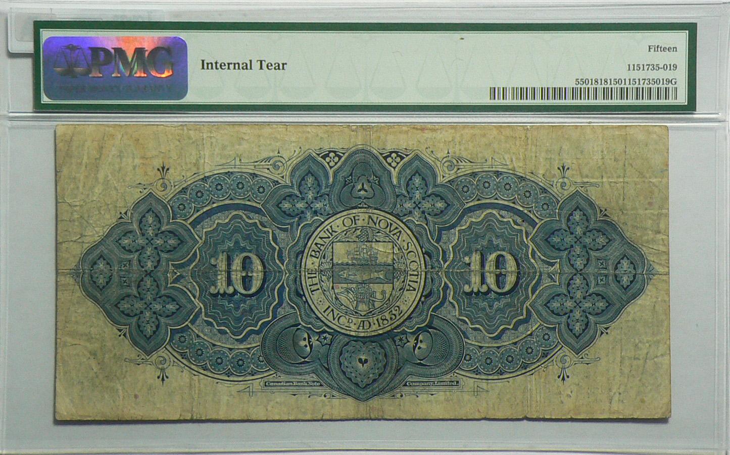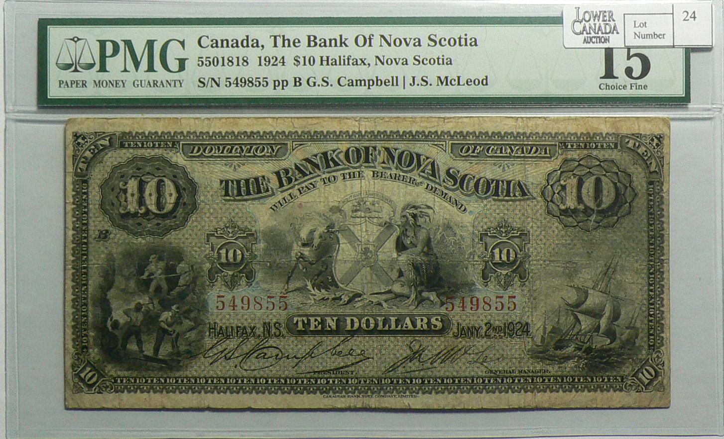 1924 Ten Dollars Bank of Nova Scotia, 550-18-18, PMG F-15, Campbell McLoed, Letter B, serial 549855.