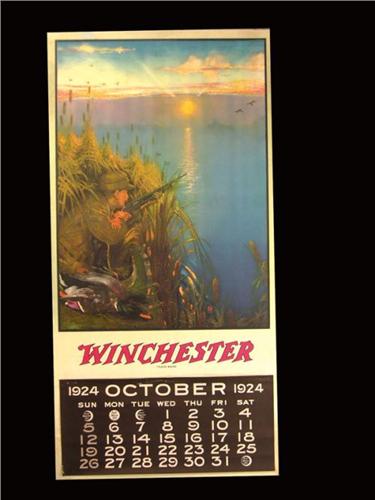 1924 Winchester Calendar, original bands top and bottom, Oct-Dec pages. G. Ruder artist depicting Hunter shooting ducks behind cattails. Framed and matted. Horizontal creases mainly at top otherwise excellent original condition. Image 14 X 28 inches.