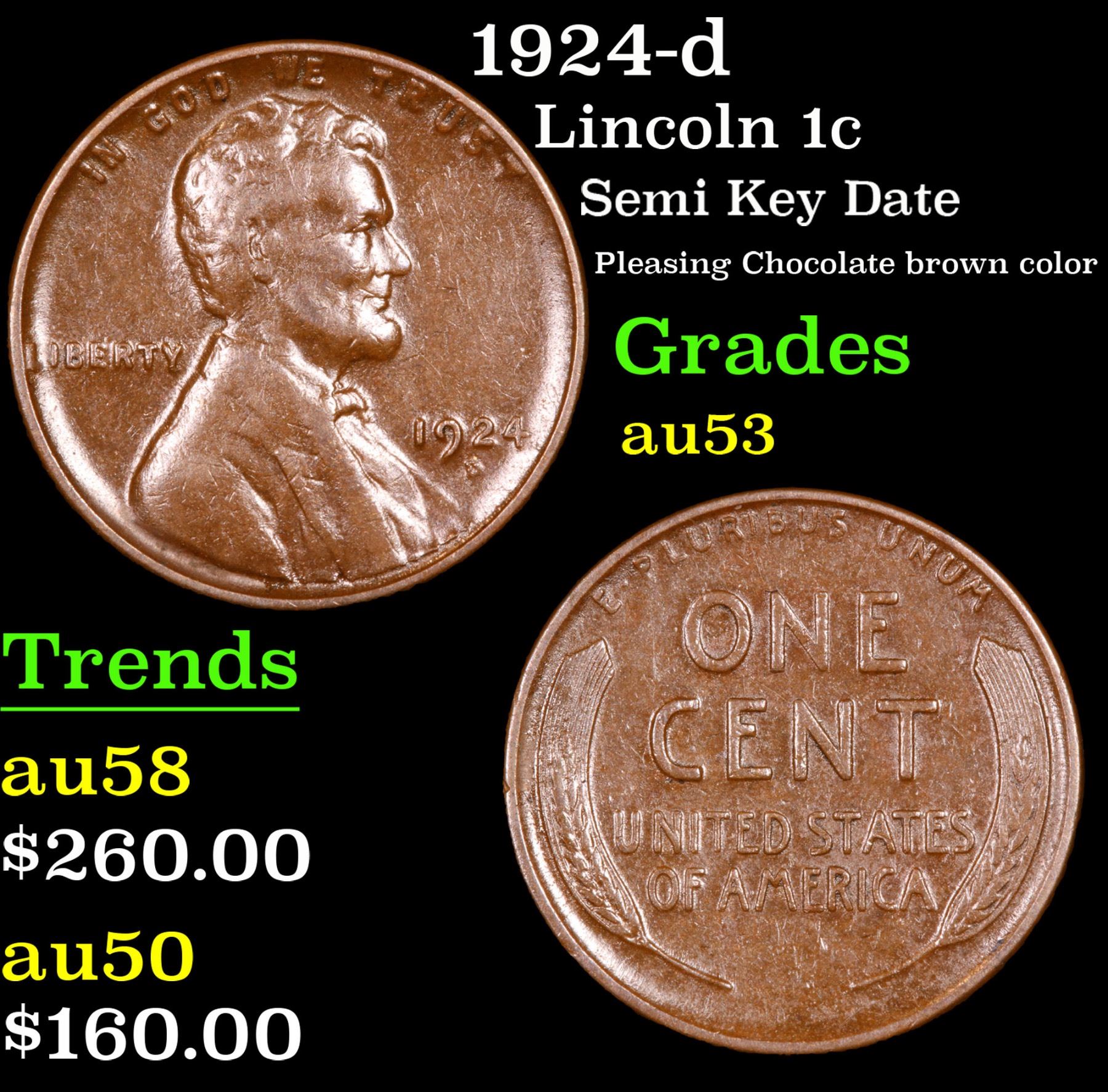 1924-d Semi Key Date Pleasing Chocolate brown color Lincoln Cent 1c Grades Select AU.