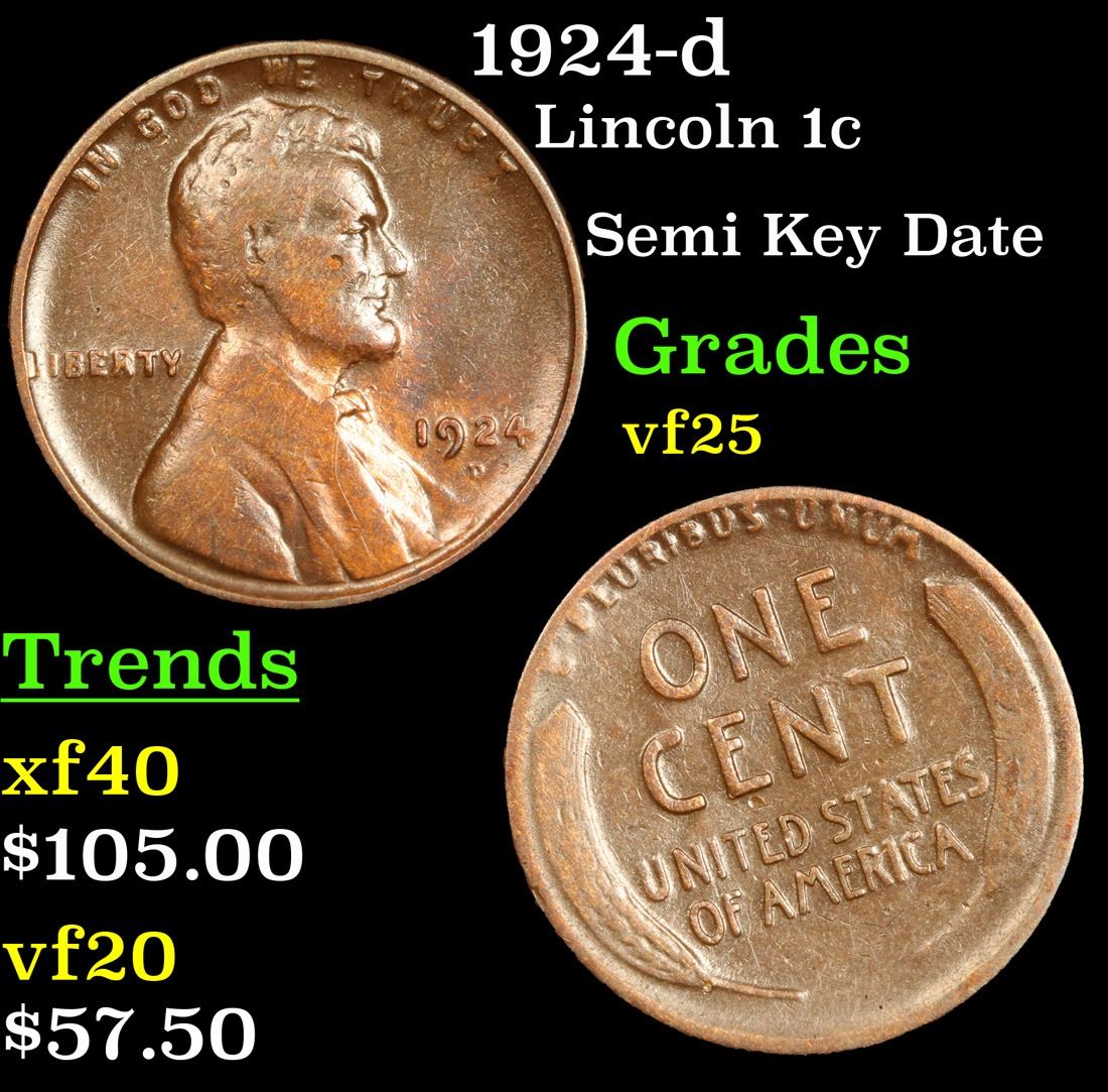 1924-d Semi Key Date . Lincoln Cent 1c Grades vf+.