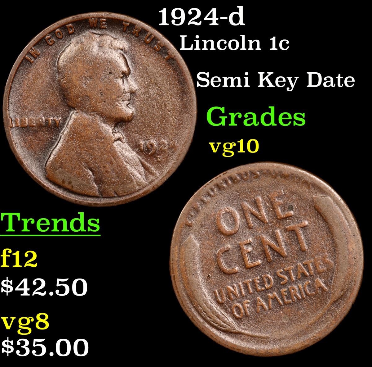 1924-d Semi Key Date . Lincoln Cent 1c Grades vg+.