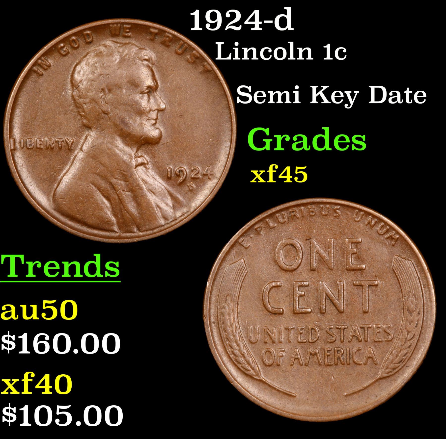 1924-d Lincoln Cent 1c Grades xf+.