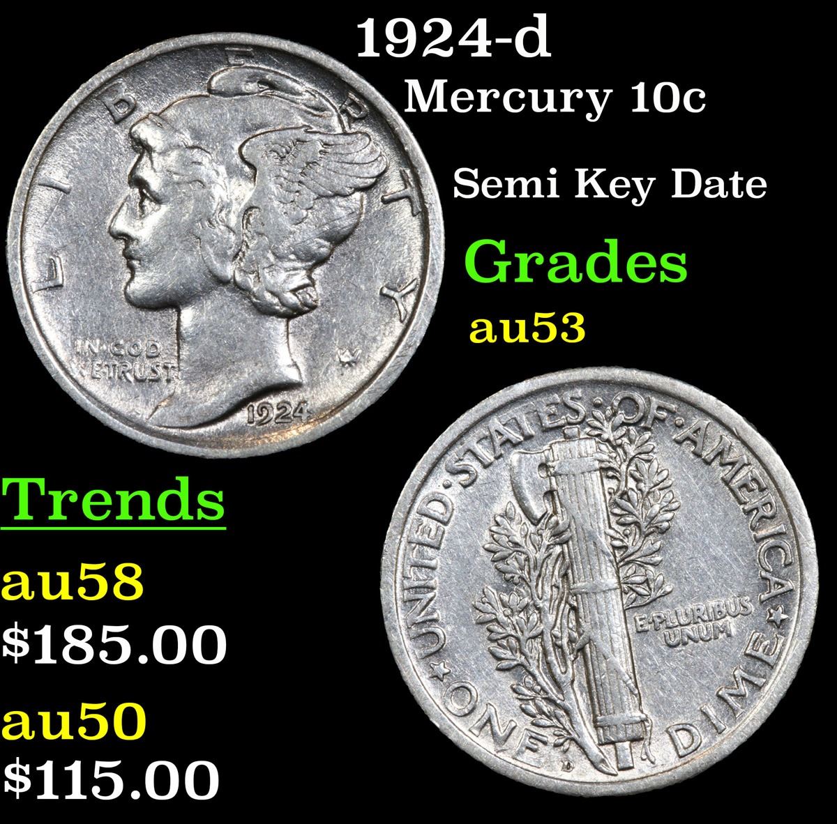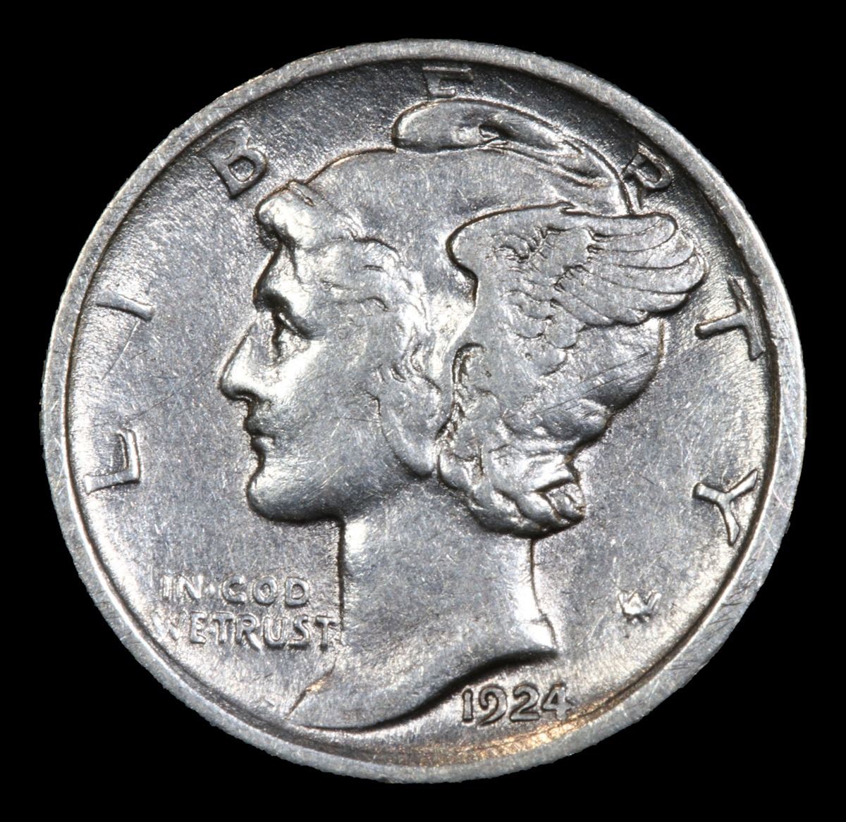 1924-d Semi Key Date . Mercury Dime 10c Grades Select AU.