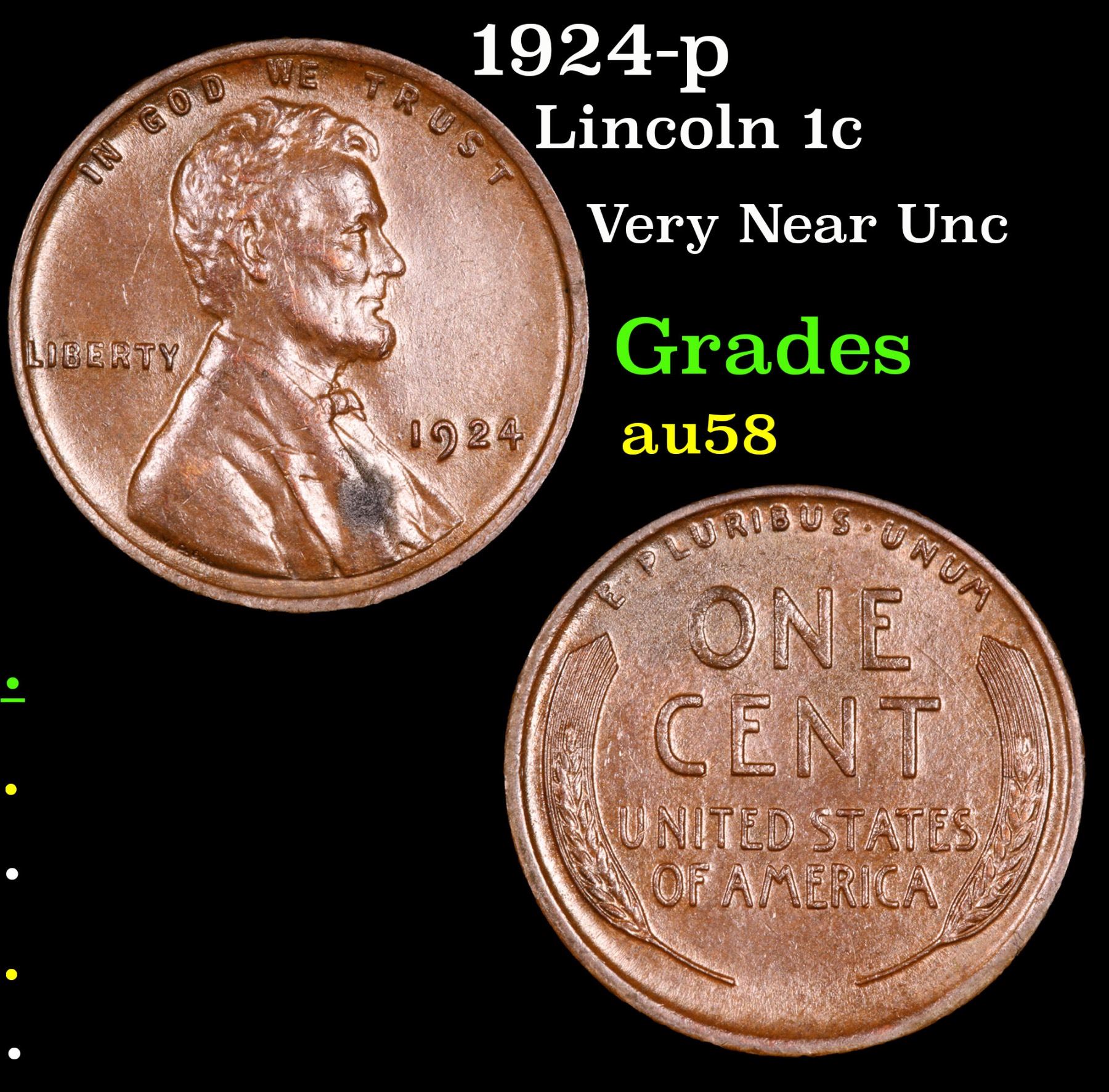 1924-p . Very Near Unc Lincoln Cent 1c Grades Choice AU/BU Slider. According to Jaime Hernandez from PCGS; from 1909 to 1929, the 1924 Lincoln cent is the third toughest Philadelphia cent in high mint state grades. Out of an original mintage of over 75 million coins, PCGS estimates only 1000 remain in ms65 or better.