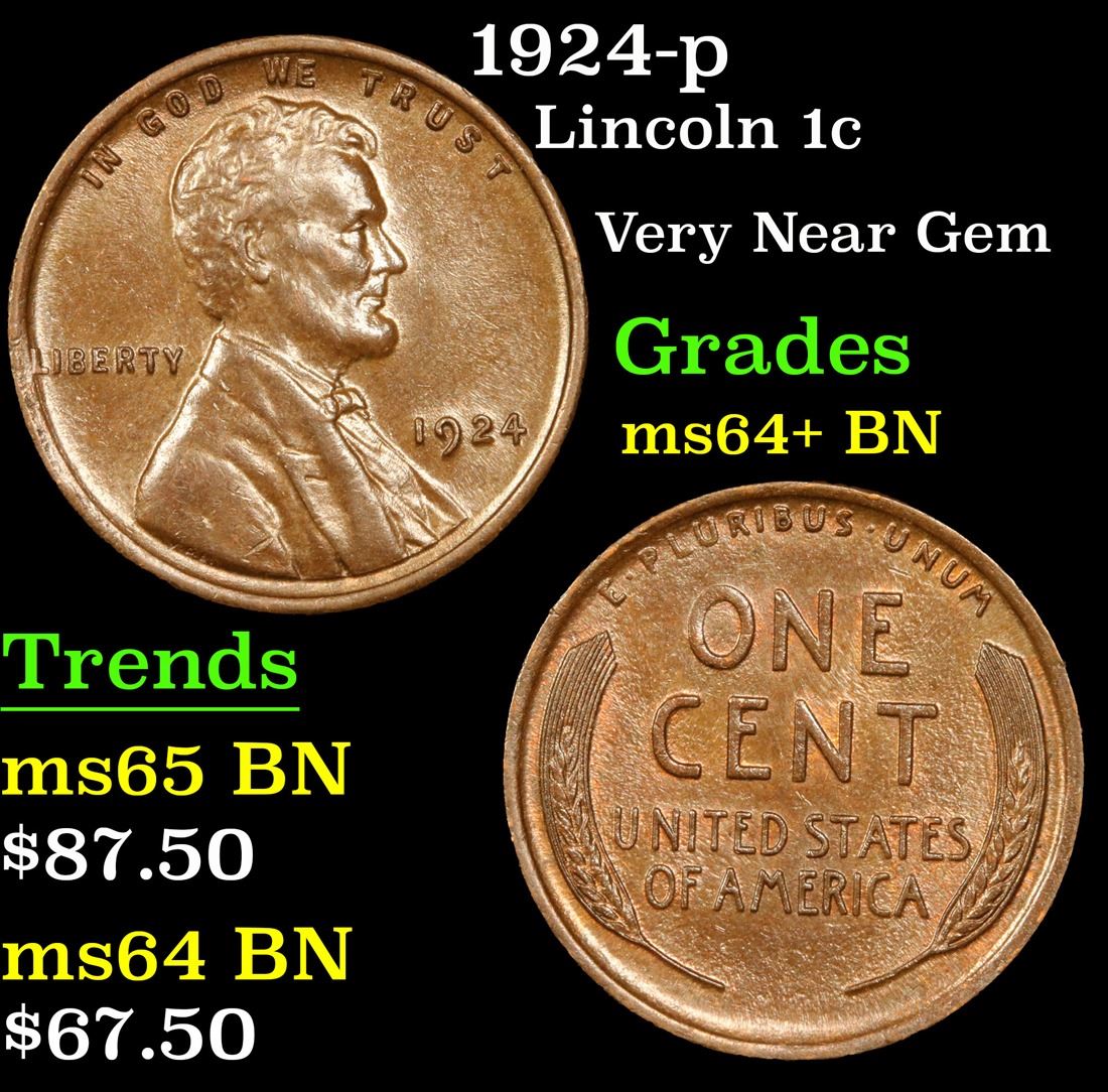 1924-p . Very Near Gem Lincoln Cent 1c Grades Choice+ Unc BN. According to Jaime Hernandez from PCGS; from 1909 to 1929, the 1924 Lincoln cent is the third toughest Philadelphia cent in high mint state grades. Out of an original mintage of over 75 million coins, PCGS estimates only 1000 remain in ms65 or better.
