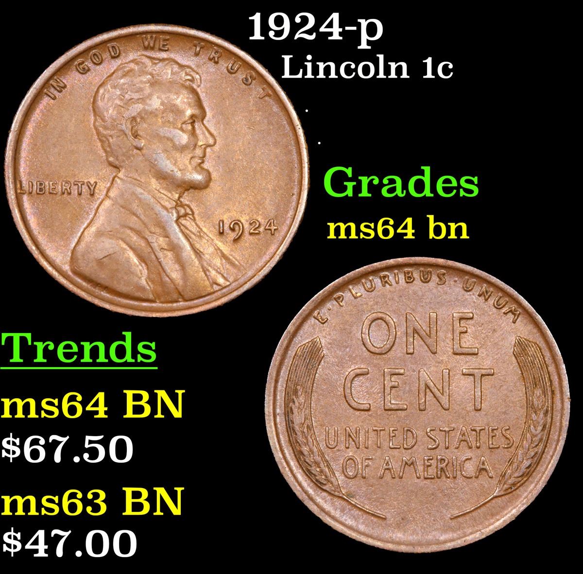 1924-p . . Lincoln Cent 1c Grades Choice Unc BN. According to Jaime Hernandez from PCGS; from 1909 to 1929, the 1924 Lincoln cent is the third toughest Philadelphia cent in high mint state grades. Out of an original mintage of over 75 million coins, PCGS estimates only 1000 remain in ms65 or better.