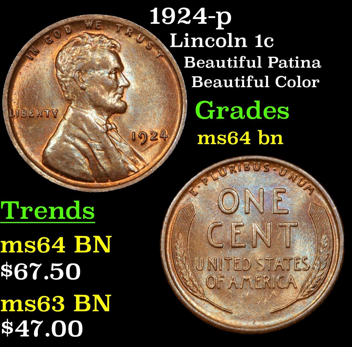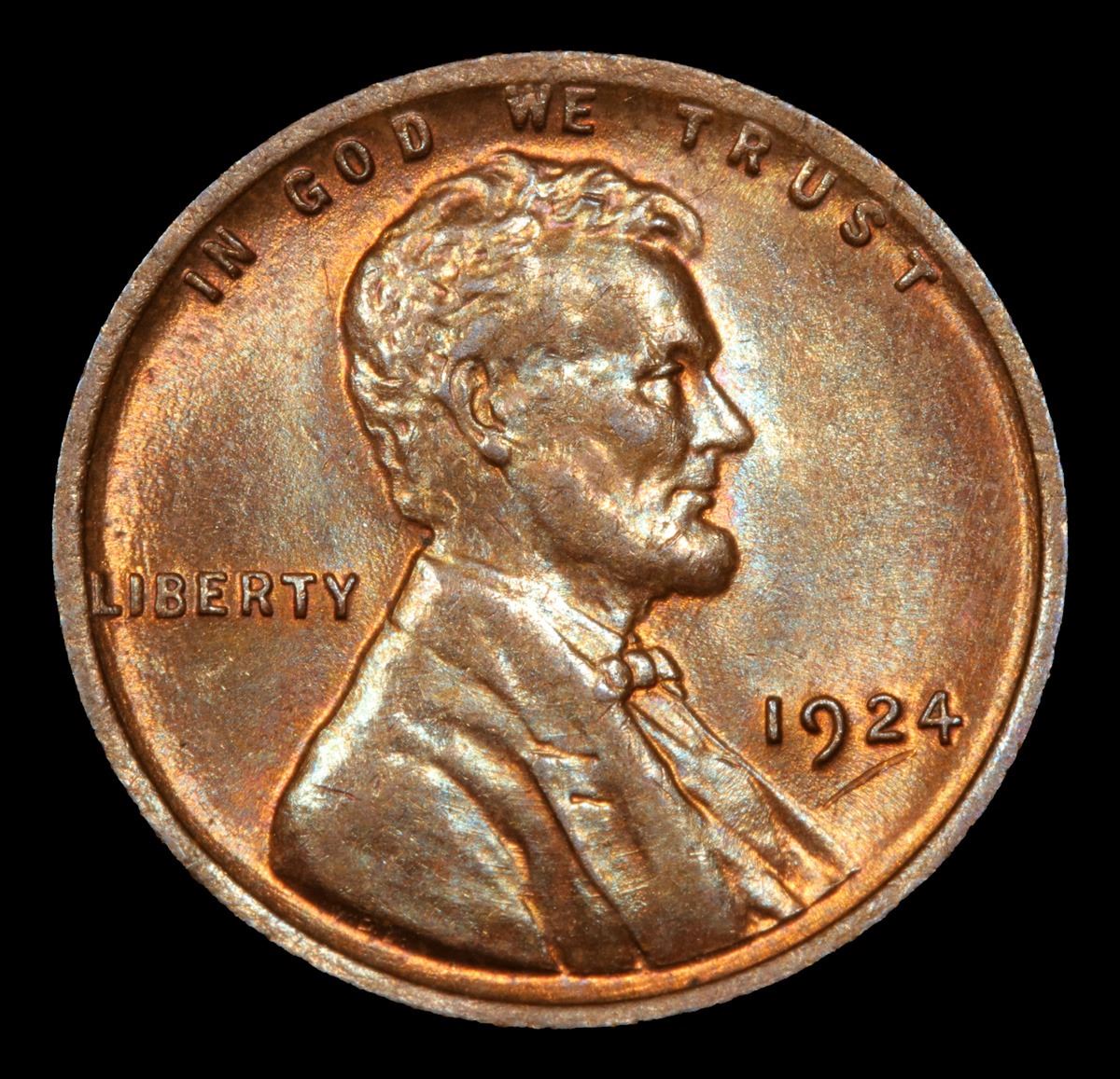 1924-p Beautiful Patina Beautiful Color Lincoln Cent 1c Grades Choice Unc BN. According to Jaime Hernandez from PCGS; from 1909 to 1929, the 1924 Lincoln cent is the third toughest Philadelphia cent in high mint state grades. Out of an original mintage of over 75 million coins, PCGS estimates only 1000 remain in ms65 or better.