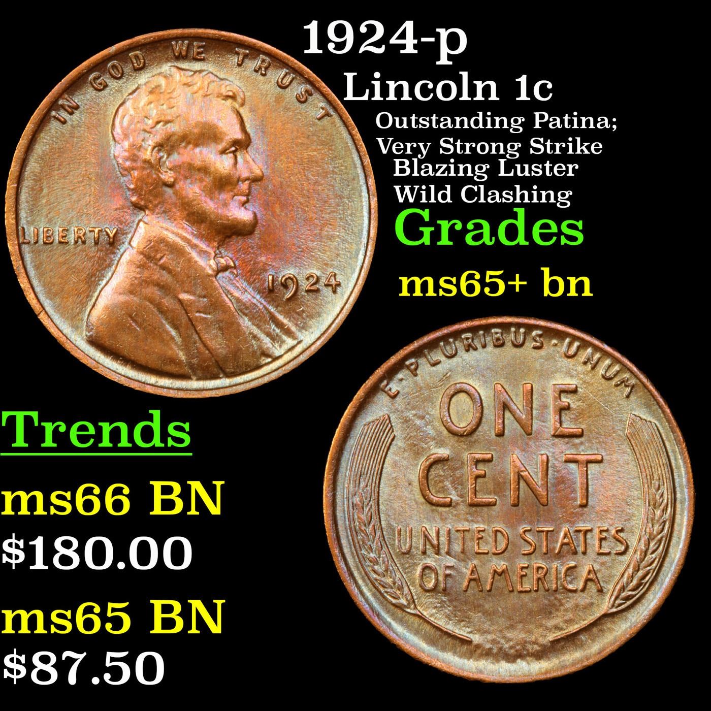 1924-p Lincoln Cent 1c Grades GEM+ Unc BN. According to Jaime Hernandez from PCGS; from 1909 to 1929, the 1924 Lincoln cent is the third toughest Philadelphia cent in high mint state grades. Out of an original mintage of over 75 million coins, PCGS estimates only 1000 remain in ms65 or better.