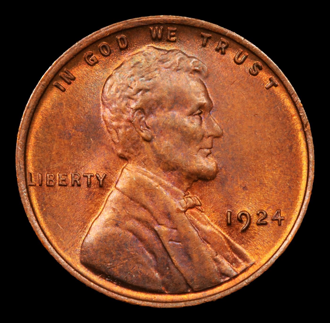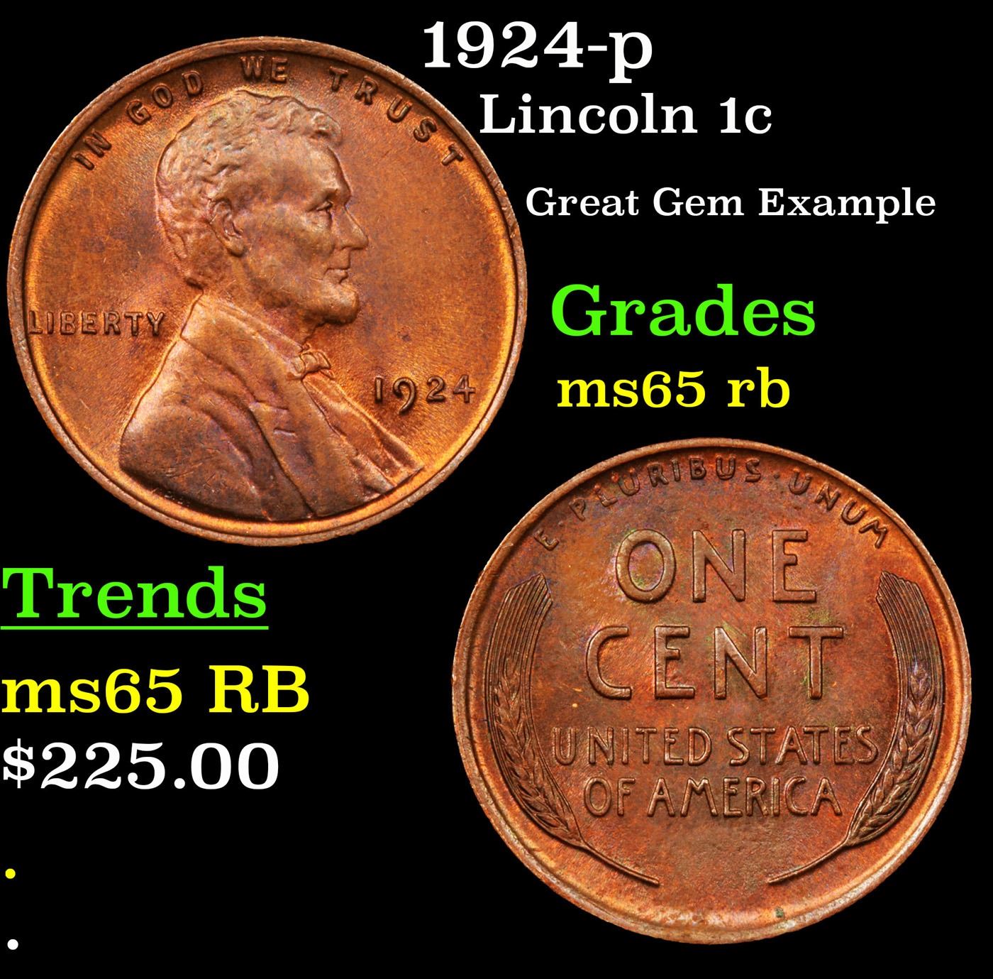 1924-p Lincoln Cent 1c Grades GEM Unc RB. According to Jaime Hernandez from PCGS; from 1909 to 1929, the 1924 Lincoln cent is the third toughest Philadelphia cent in high mint state grades. Out of an original mintage of over 75 million coins, PCGS estimates only 1000 remain in ms65 or better.
