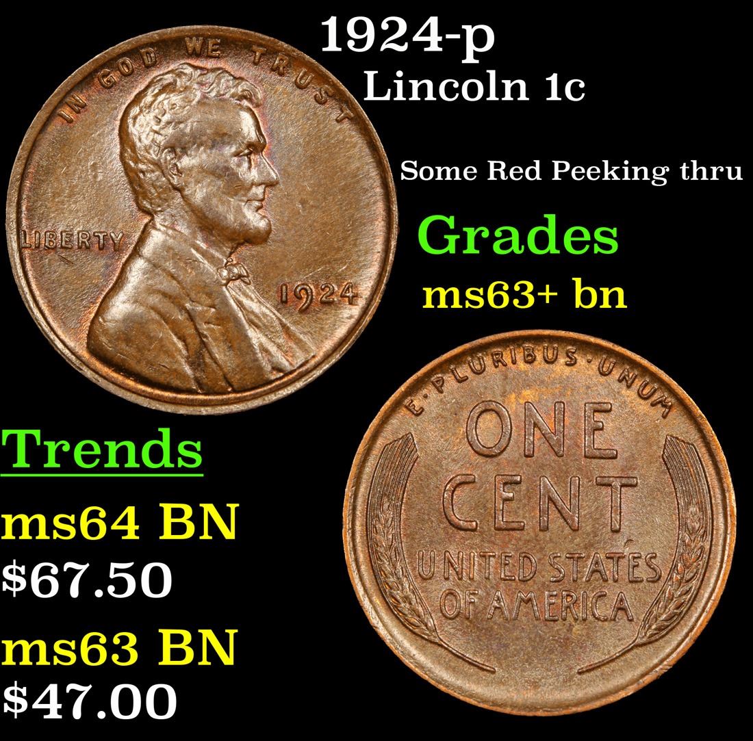 1924-p Some Red Peeking thru . Lincoln Cent 1c Grades Select+ Unc BN.  According to Jaime Hernandez from PCGS; from 1909 to 1929, the 1924 Lincoln cent is the third toughest Philadelphia cent in high mint state grades.  Out of an original mintage of over 75 million coins, PCGS estimates only 1000 remain in ms65 or better.