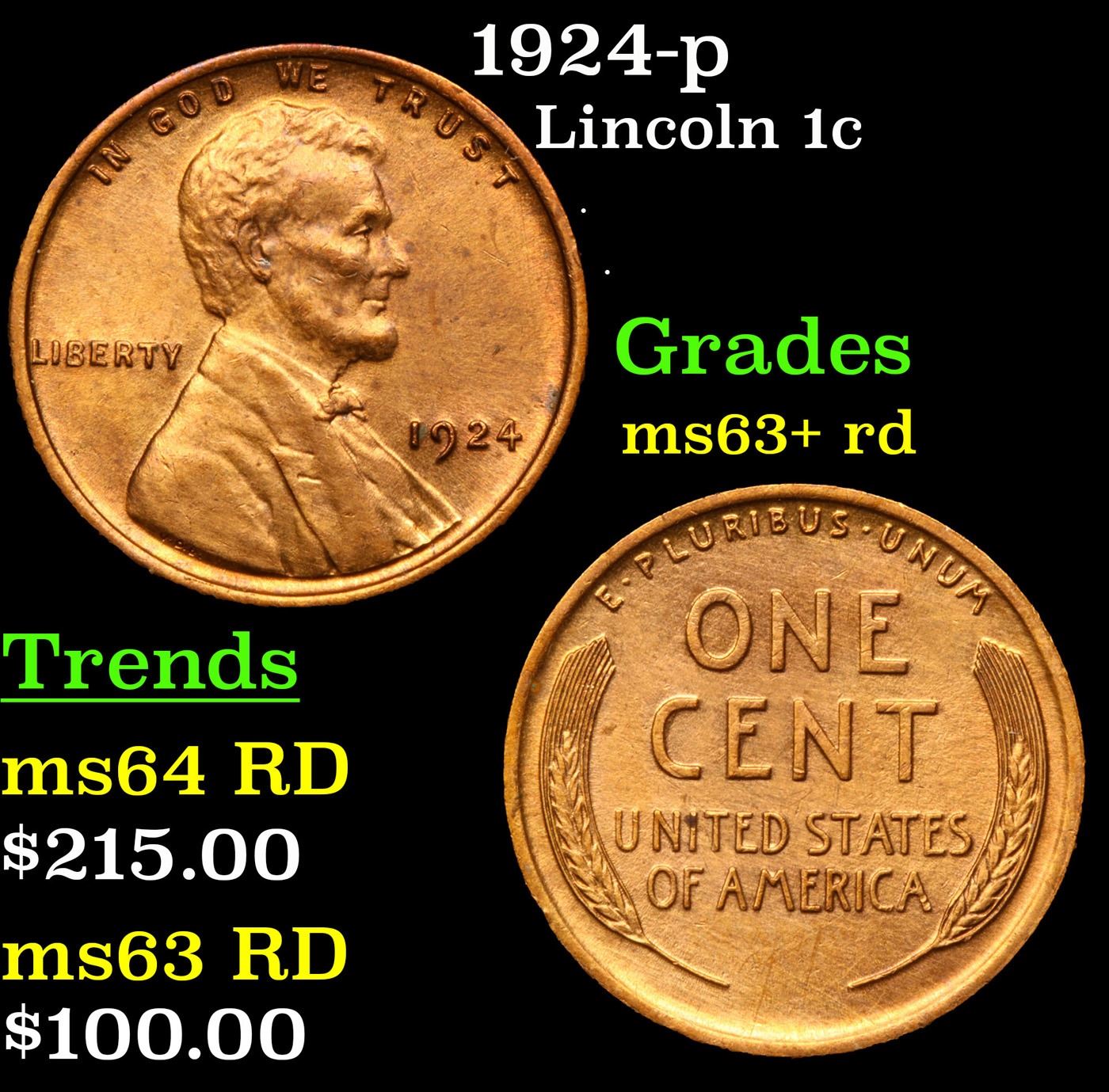 1924-p Lincoln Cent 1c Grades Select+ Unc RD. According to Jaime Hernandez from PCGS; from 1909 to 1929, the 1924 Lincoln cent is the third toughest Philadelphia cent in high mint state grades. Out of an original mintage of over 75 million coins, PCGS estimates only 1000 remain in ms65 or better.