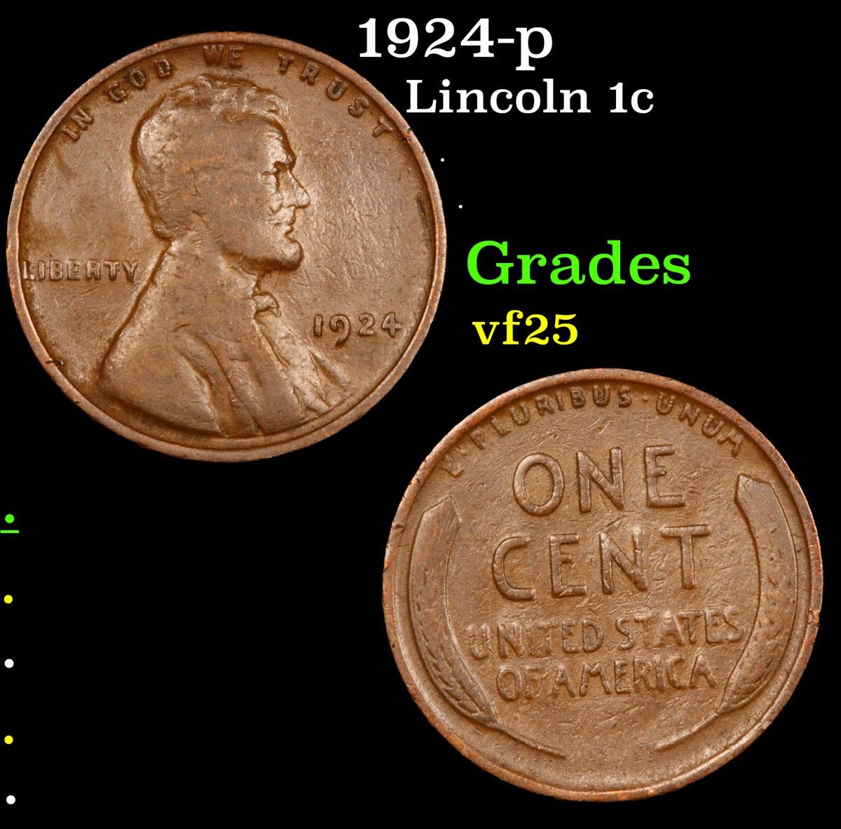 1924-p Lincoln Cent 1c Grades vf+. According to Jaime Hernandez from PCGS; from 1909 to 1929, the 1924 Lincoln cent is the third toughest Philadelphia cent in high mint state grades. Out of an original mintage of over 75 million coins, PCGS estimates only 1000 remain in ms65 or better.