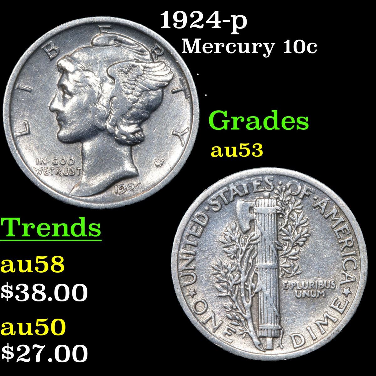 1924-p . . Mercury Dime 10c Grades Select AU.