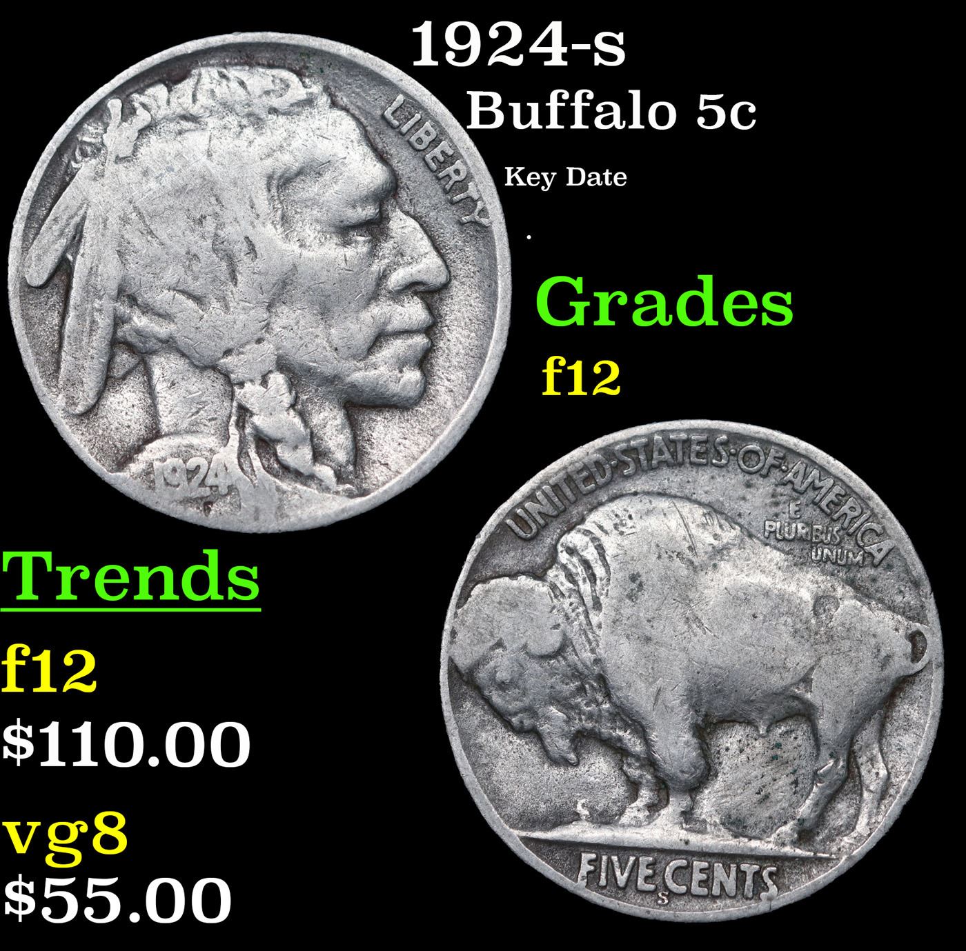 1924-s Buffalo Nickel 5c Grades f, fine.