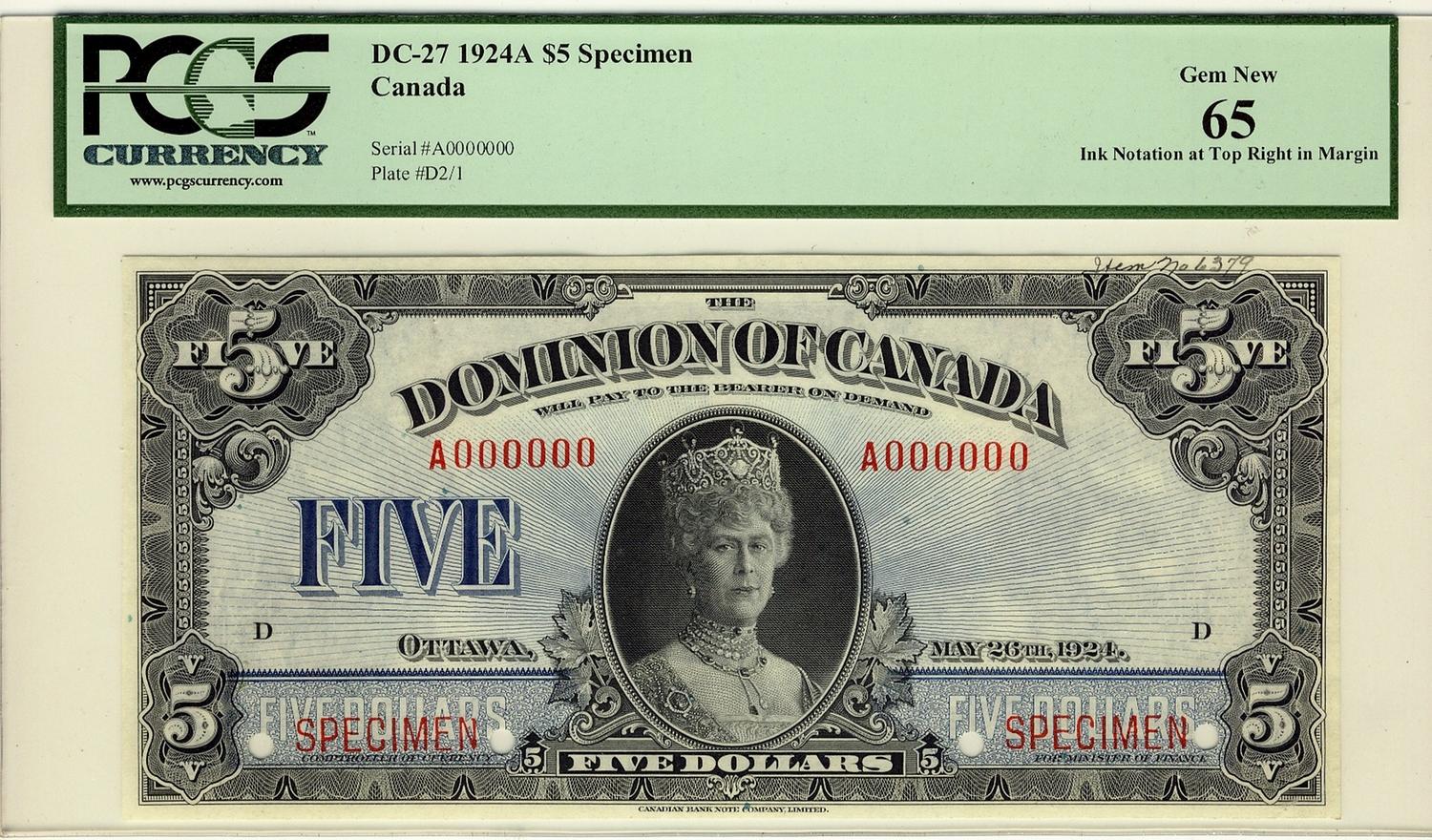 1924A DC-27 #A000000 Specimen, PCGS Gem UNC65. Superb centering and very bright. The nicest example ever seen and handled by TCNC. Rare and desirable. Despite all catalogues and expect strong bidding on this item.
