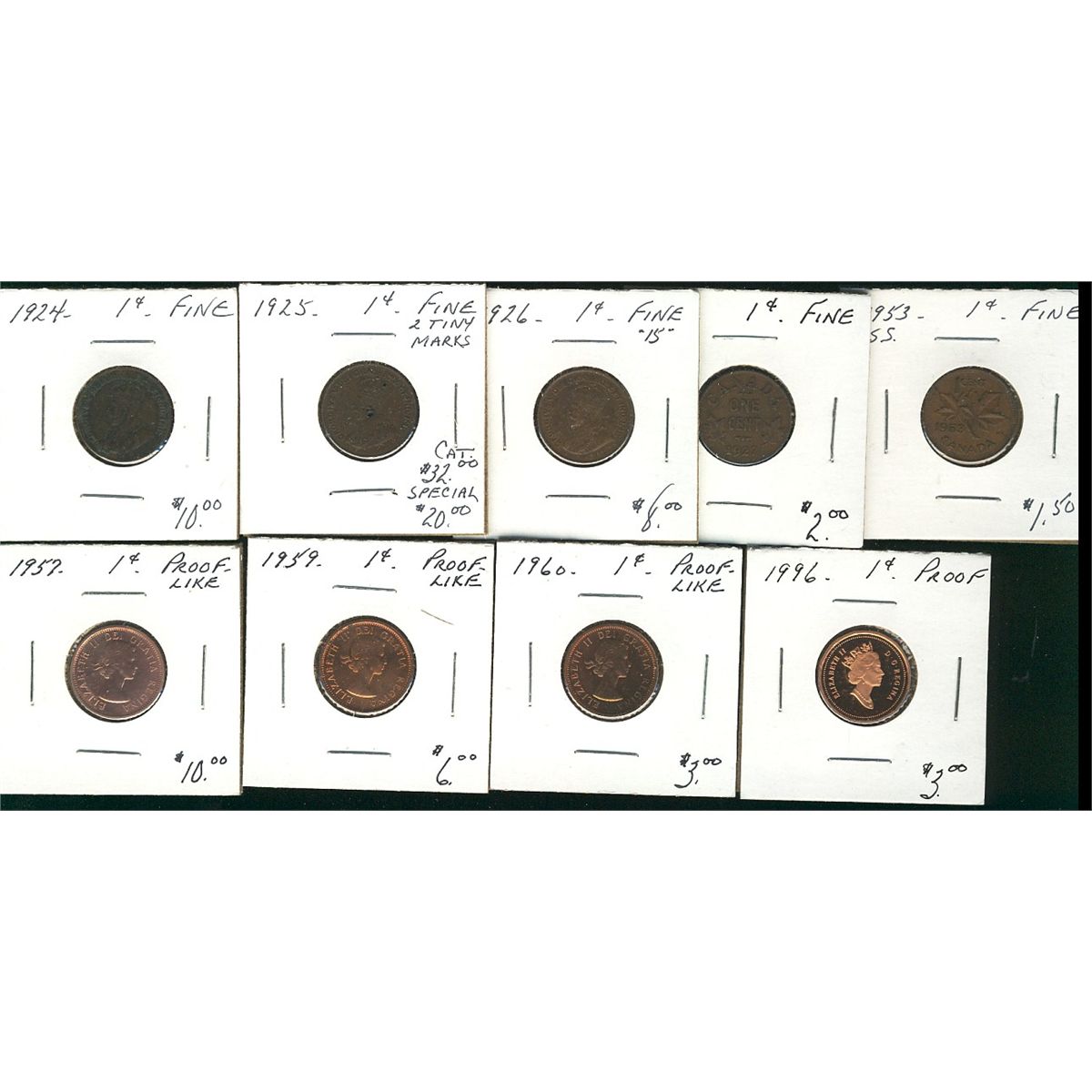 1925 1¢, 1926, 1927, 1953 SF, 1957, 1959, 1960 & 1996. Lot of 9 coins. Fine to PL. (PBA)