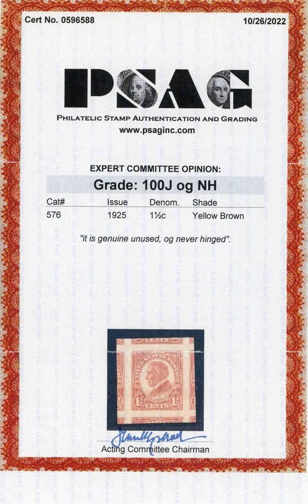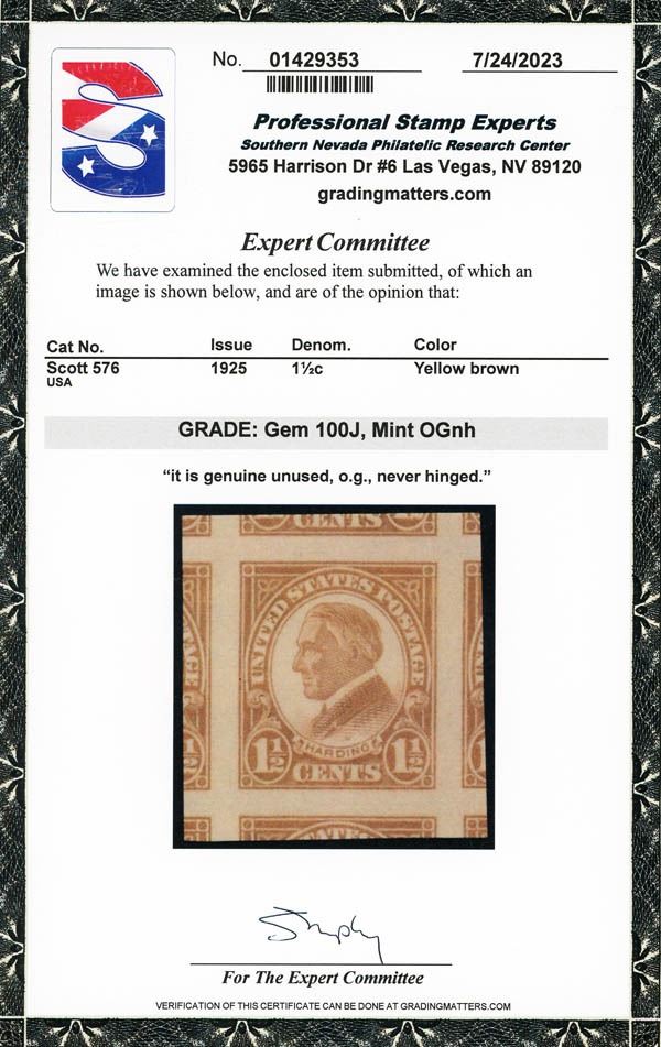 1925, 1½¢ Harding, imperf. Scott 576. SMQ $125, 100, with 2023 P.S.E. and 2022 P.S.A.G. certificates, each graded GEM 100J