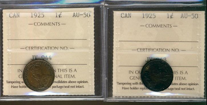 1925 1¢ ICCS AU50. Lot of 2 key issues.