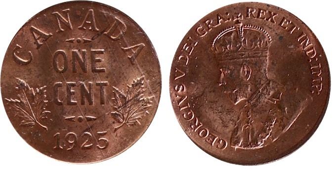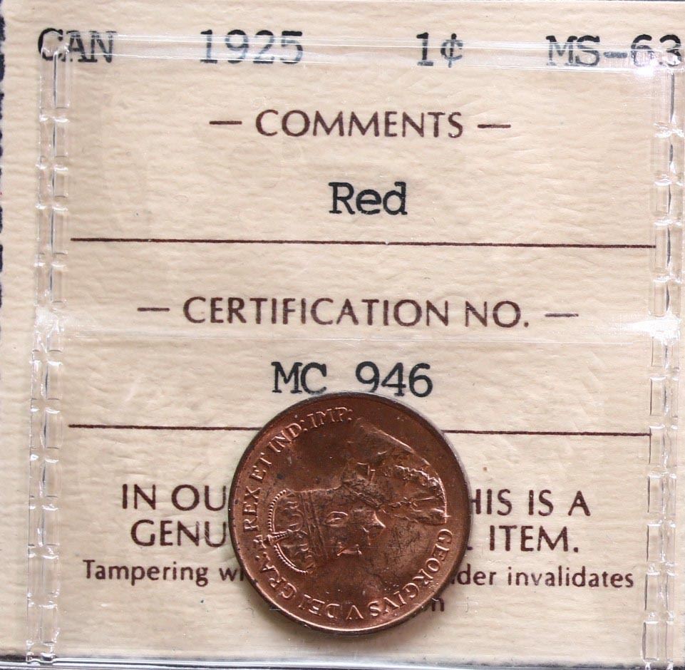 1925 1¢ ICCS Choice Mint State-63RED.  A nice lustrous 95% Red key example.