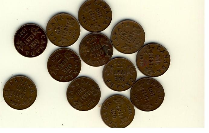 1925 1¢. Lot of 12 coins VF+ to EF..
