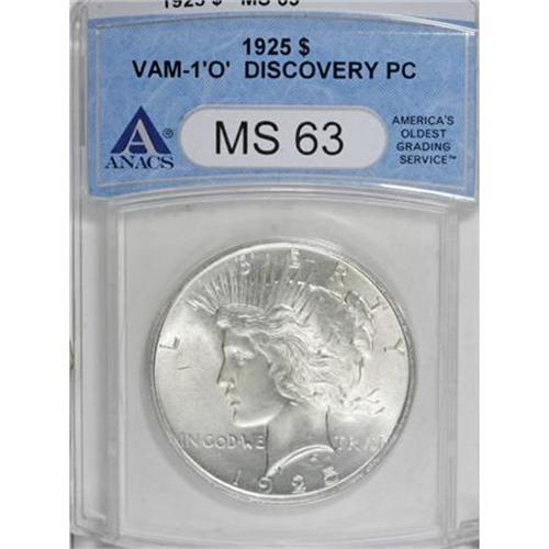 <B>1925 $1 MS63 ANACS.</B></I> VAM-1 'O' Discovery Piece. NGC Census: (4593/22212). PCGS Population (5892/18017). Mintage: 10,198,000. Numismedia Wsl. Price for NGC/PCGS coin in MS63: $27. (#7365)<BR><BR><B>Coin Engraver:</B> Anthony de Francisci<BR><BR><b>Shipping:</b> Coins & Currency (<a target="_blank" href="http://www.heritageauctions.com/common/shipping.php">view shipping information</a>)