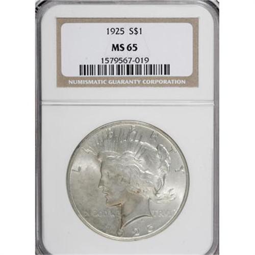 <B>1925 $1 MS65 NGC.</B></I> . NGC Census: (7134/1085). PCGS Population (5402/1274). Mintage: 10,198,000. Numismedia Wsl. Price for NGC/PCGS coin in MS65: $135. (#7365)<BR><BR><B>Coin Engraver:</B> Anthony de Francisci<BR><BR><b>Shipping:</b> Coins & Currency (<a target="_blank" href="http://www.heritageauctions.com/common/shipping.php">view shipping information</a>)