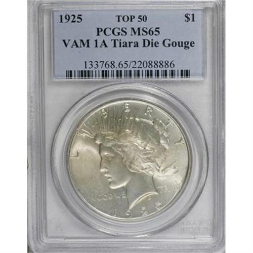<B>1925 $1 MS65 PCGS.</B></I> Vam-1A, Tiara Die Gouge, Top 50. PCGS Population (3/4). NGC Census: (0/0). (#133768)<BR><BR><b>Shipping:</b> Coins & Currency (<a target="_blank" href="http://www.heritageauctions.com/common/shipping.php">view shipping information</a>)