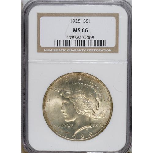<B>1925 $1 MS66 NGC.</B></I> NGC Census: (1896/70). PCGS Population (1166/66). Mintage: 10,198,000. Numismedia Wsl. Price for NGC/PCGS coin in MS66: $590. (#7365)<BR><BR><b>Shipping:</b> Coins & Currency (<a target="_blank" href="http://www.heritageauctions.com/common/shipping.php">view shipping information</a>)