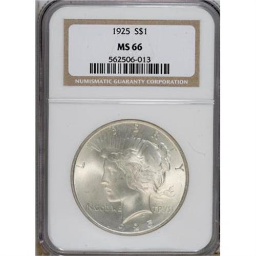 <B>1925 $1 MS66 NGC.</B></I> NGC Census: (957/35). PCGS Population (1165/66). Mintage: 10,198,000. Numismedia Wsl. Price for NGC/PCGS coin in MS66: $590. (#7365)<BR><BR><b>Shipping:</b> Coins & Currency (<a target="_blank" href="http://www.heritageauctions.com/common/shipping.php">view shipping information</a>)