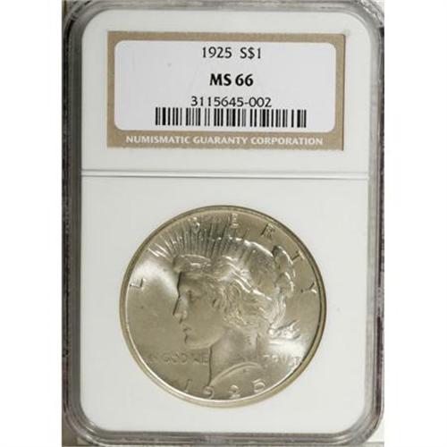 <B>1925 $1 MS66 NGC.</B></I> NGC Census: (977/39). PCGS Population (1196/67). Mintage: 10,198,000. Numismedia Wsl. Price for NGC/PCGS coin in MS66: $590. (#7365)<BR><BR><B>Coin Engraver:</B> Anthony de Francisci<BR><BR><b>Shipping:</b> Coins & Currency (<a target="_blank" href="http://www.heritageauctions.com/common/shipping.php">view shipping information</a>)