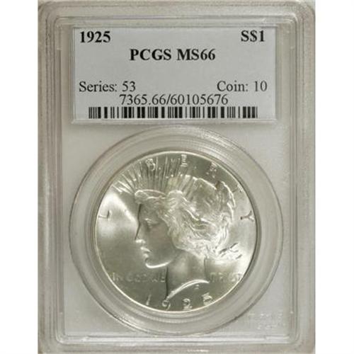 <B>1925 $1 MS66 PCGS.</B></I> PCGS Population (1181/66). NGC Census: (971/39). Mintage: 10,198,000. Numismedia Wsl. Price for NGC/PCGS coin in MS66: $590. (#7365)<BR><BR><B>Coin Engraver:</B> Anthony de Francisci<BR><BR><b>Shipping:</b> Coins & Currency (<a target="_blank" href="http://www.heritageauctions.com/common/shipping.php">view shipping information</a>)