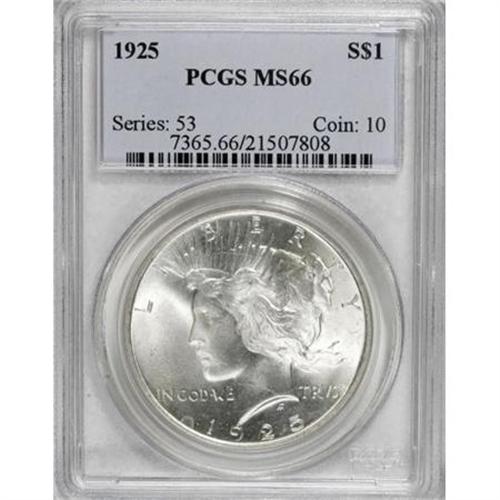 <B>1925 $1 MS66 PCGS.</B></I> PCGS Population (1187/66). NGC Census: (977/39). Mintage: 10,198,000. Numismedia Wsl. Price for NGC/PCGS coin in MS66: $590. (#7365)<BR><BR><B>Coin Engraver:</B> Anthony de Francisci<BR><BR><b>Shipping:</b> Coins & Currency (<a target="_blank" href="http://www.heritageauctions.com/common/shipping.php">view shipping information</a>)