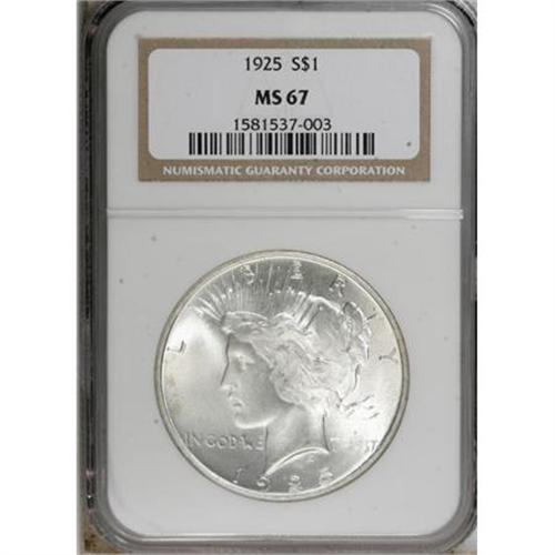 <B>1925 $1 MS67 NGC.</B></I> A thoroughly lustrous Superb Gem with well preserved fields and an assertive strike. The obverse border has a hint of tan patina, but the surfaces are otherwise brilliant. The obverse has a mattelike appearance, as delivered from a die long in use. Census: 36 in 67, 1 finer (5/07).<BR><BR><b>Shipping:</b> Coins & Currency (<a target="_blank" href="http://www.heritageauctions.com/common/shipping.php">view shipping information</a>)