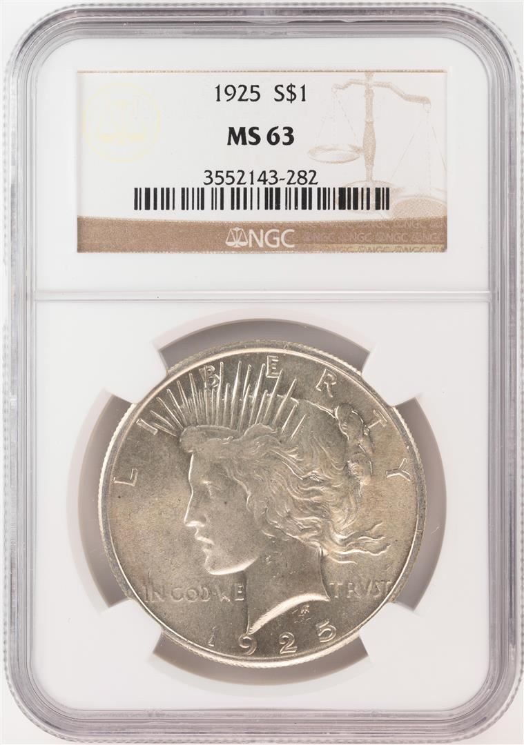 One 1925 $1 Peace Silver Dollar Coin NGC MS63. NGC Certified.