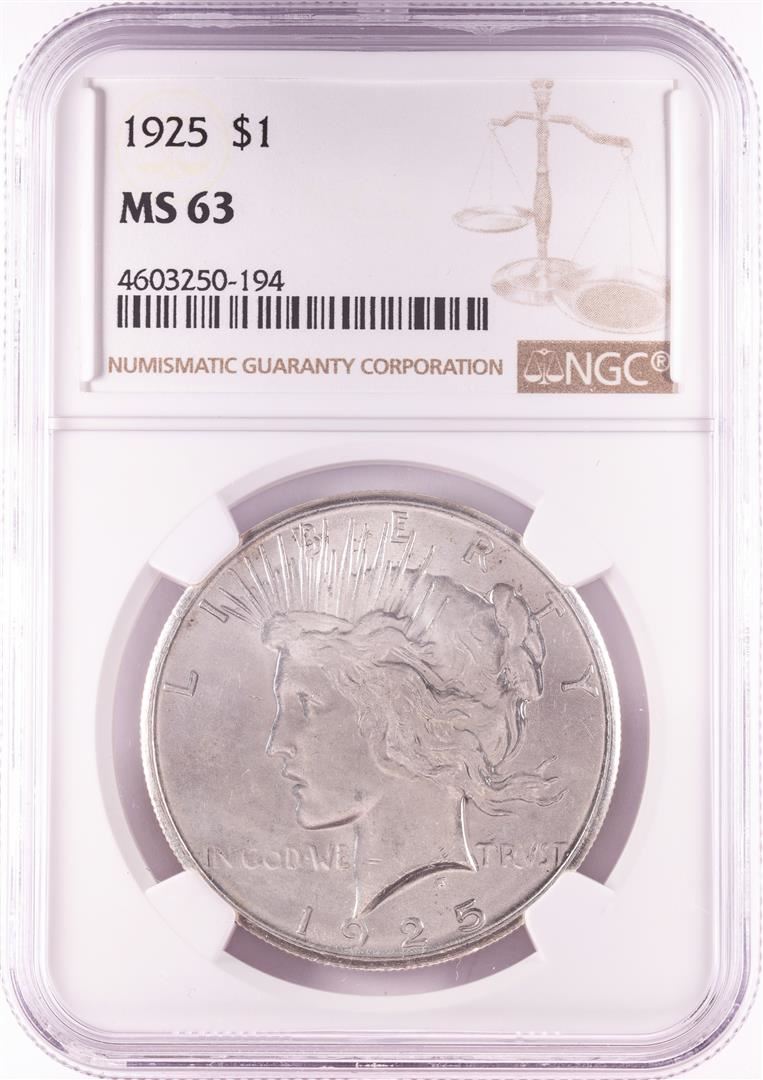 One 1925 $1 Peace Silver Dollar Coin NGC MS63. NGC Certified.