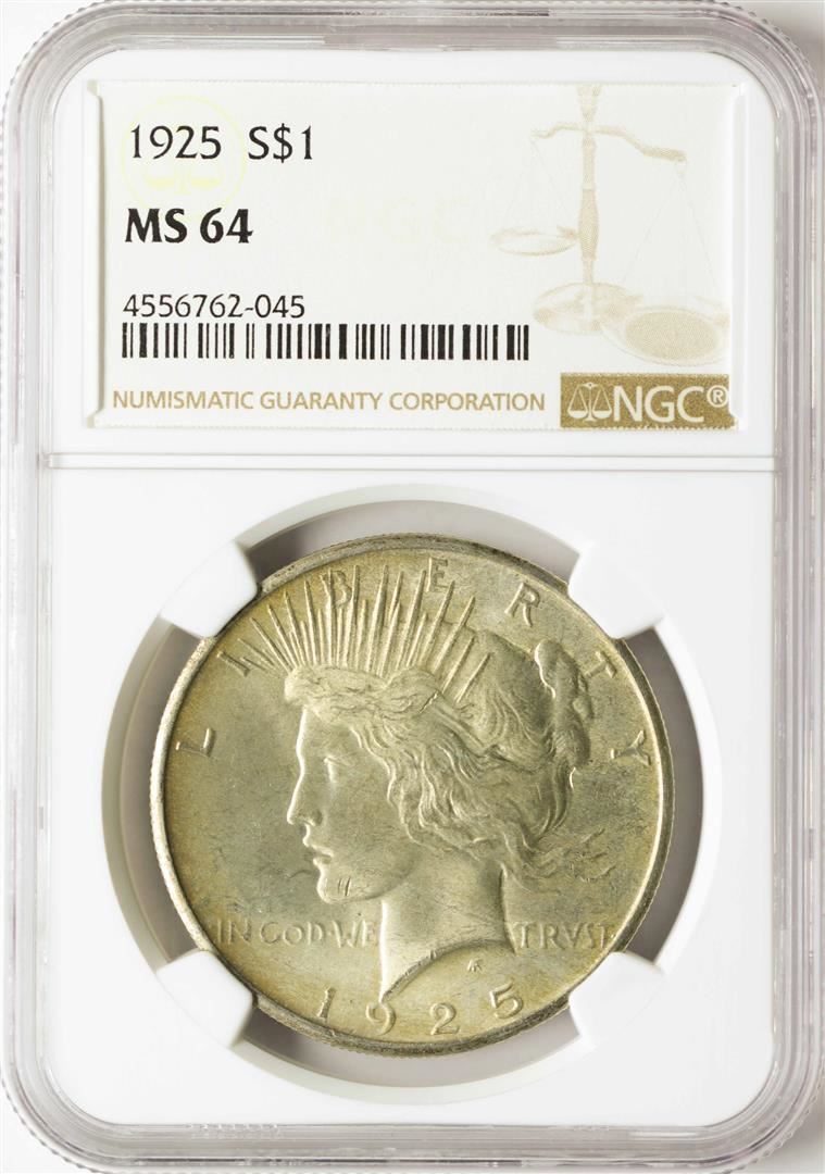 One 1925 $1 Peace Silver Dollar Coin NGC MS64. NGC Certified.