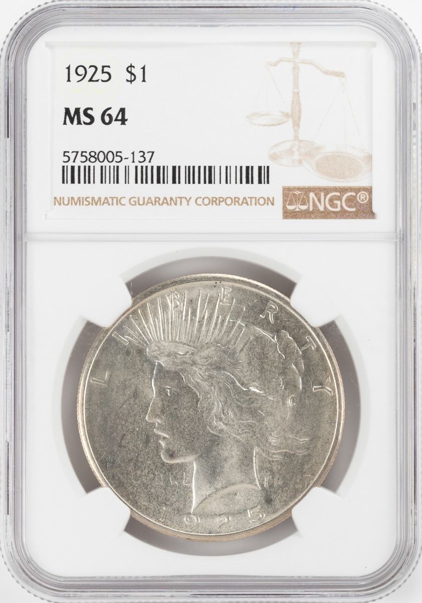 One 1925 $1 Peace Silver Dollar Coin NGC MS64.