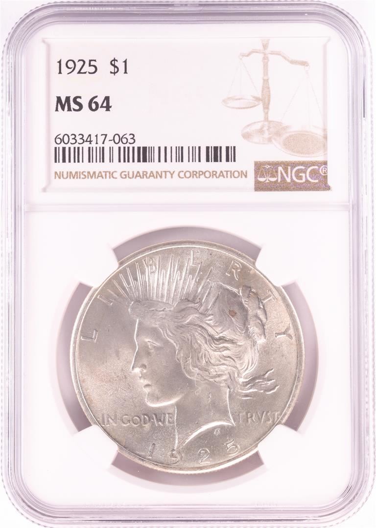 One 1925 $1 Peace Silver Dollar Coin NGC MS64. NGC Certified.
