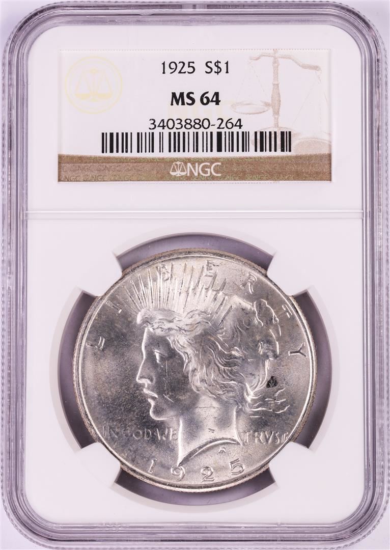 One 1925 $1 Peace Silver Dollar Coin NGC MS64. NGC Certified.